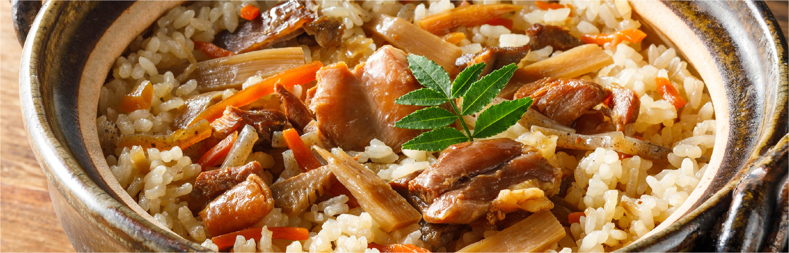 希少な名古屋コーチンもも肉と国産具材(たけのこ・人参・こんにゃく・ごぼう)を使用した、素材の旨みが味わえる地鶏五目めしの素です。