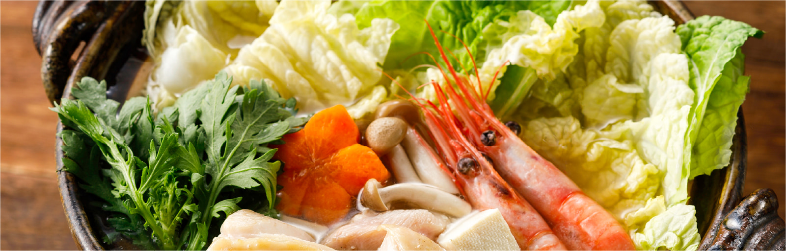 希少な名古屋コーチンの鶏がらを 釜で丹念に炊き出した“地鶏だし”と、昆布・鰹節の”一番だし“が調和した、旨味と香り豊かな寄せ鍋です。