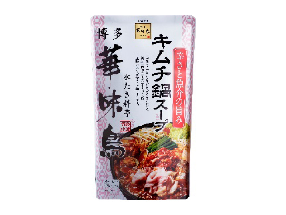 韓国コチュジャンと魚介の旨みを合わせた料亭「博多華味鳥」オリジナルの風味豊かな旨辛キムチ鍋スープです。