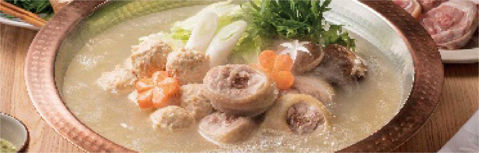「鶏かさね炊き製法」でじっくり炊きだした鶏がらと丸鶏の旨みを重ねた白濁スープは、煮込むほど具材の旨みも深まる、料亭「博多華味鳥」自慢のスープです。