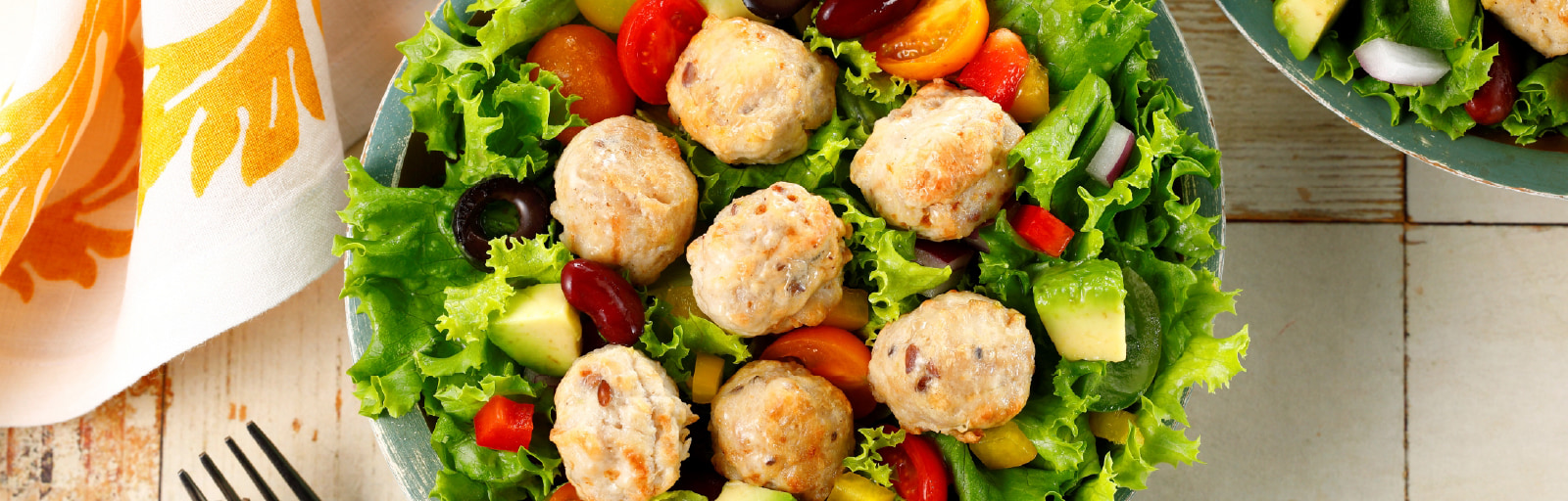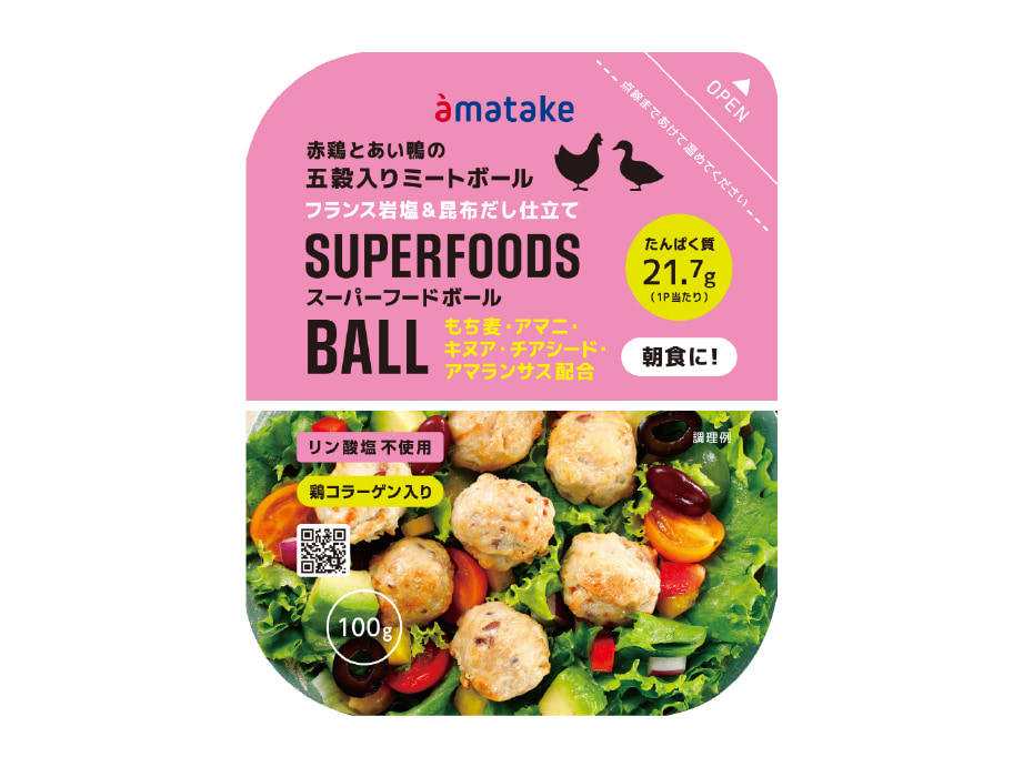 アマタケの鶏肉・あい鴨肉を使った鶏コラーゲン入りのミートボールです。もち麦、アマニ、キヌア、チアシード、アマランサスの五穀を配合し、フランス岩塩と昆布だしで仕立てました。