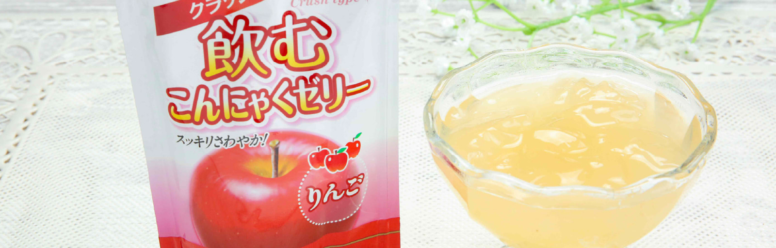 青森県の契約農家が育てた元気なりんごの果汁を搾り、体に優しい天然素材・寒天とこんにゃく粉で、ぷるぷるな食感に仕上げました。
