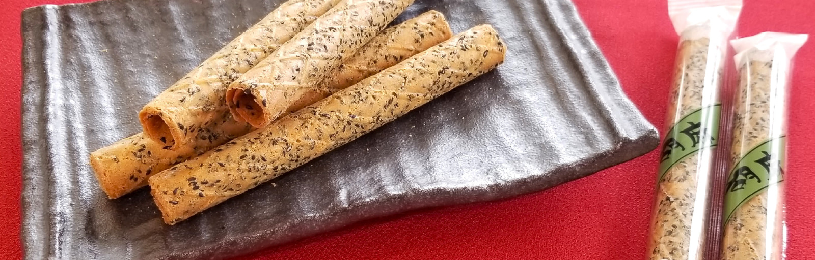 胡麻をたっぷり練りこんだ生地を薄く焼き上げロール状に巻いて作りました。