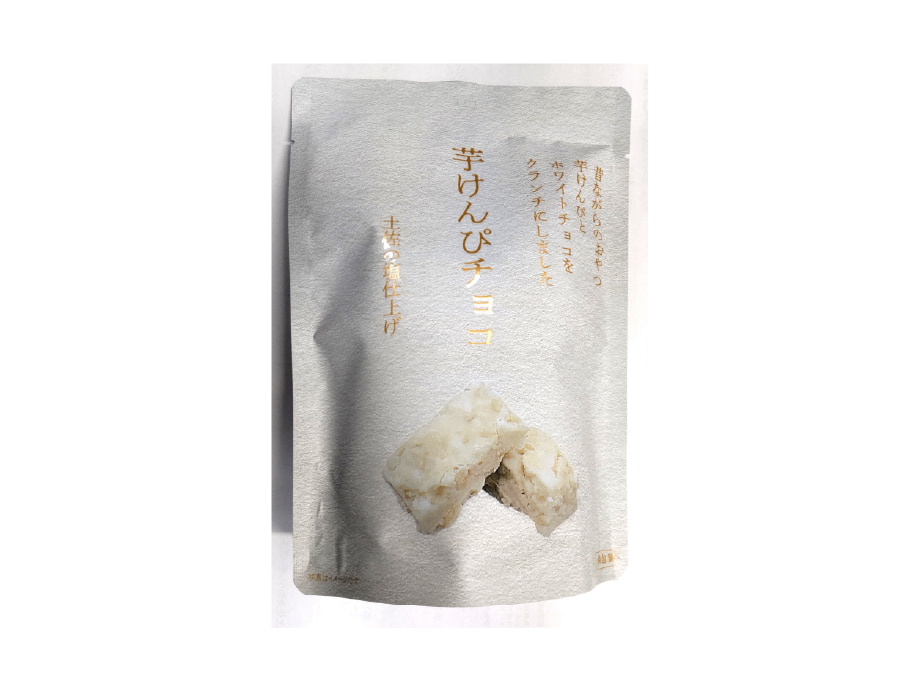 『芋けんぴ』をクランチにして、ホワイトチョコをかけました。ザクザクとした嚙み心地も良く、味も美味しいお菓子になりました。高知の天日塩「土佐の塩丸」を使用し、ほんのり塩味を感じるお菓子です。