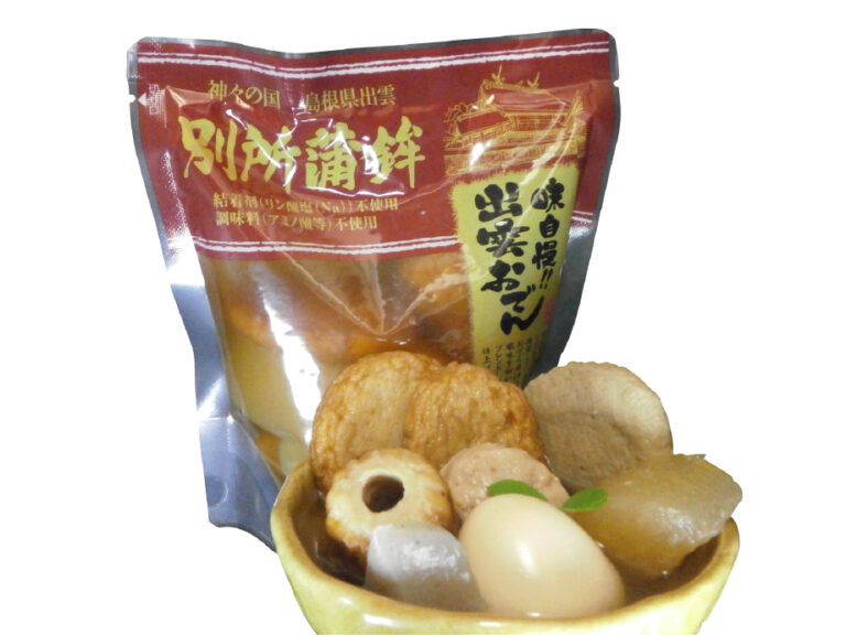 別所蒲鉾 出雲おでん 無添加練り物5種に国産大根、有機こんにゃく、厳選した玉子を入れました。国産丸大豆醤油をベースに昆布と鰹の風味を利かせただしを自社ブレンドした味自慢のおでんです。いつでも本格派おでんが楽しめます。