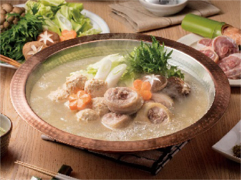 「鶏かさね炊き製法」でじっくり炊きだした鶏がらと丸鶏の旨みを重ねた白濁スープは、煮込むほど具材の旨みも深まる、料亭「博多華味鳥」自慢のスープです。 -