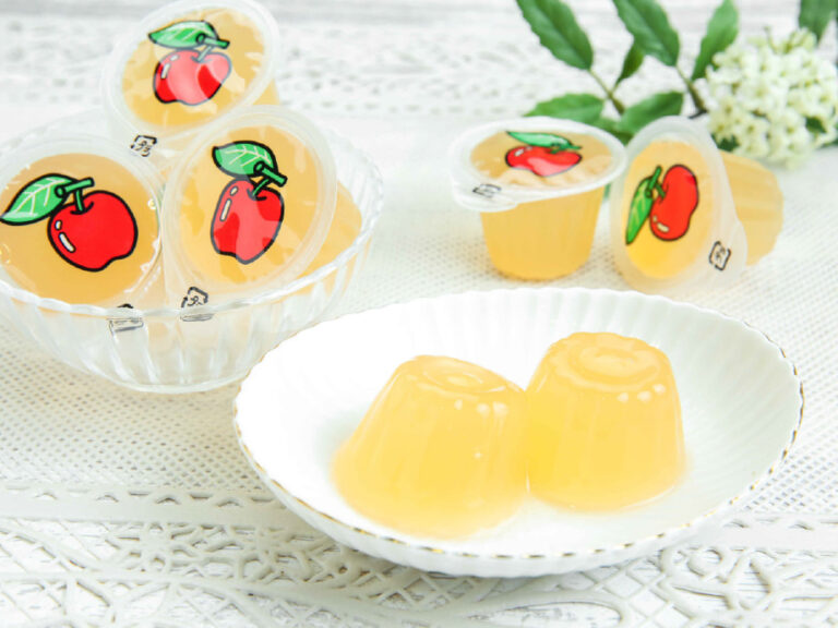青森県の契約農家が育てた元気なりんごの果汁を搾り、体に優しい天然素材・寒天とこんにゃく粉で、ぷるぷるな食感に仕上げました。 -