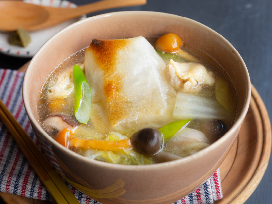 - 6器に[5]を盛り、こんがり焼いたもちをのせ、好みで柚子こしょうを添える。