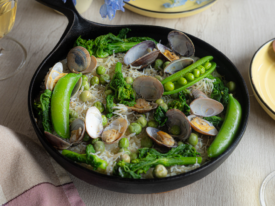 - 4グリンピースを加えて再びふたをし、3~5分加熱する。火を止め、あさりとスナップえんどう、菜の花をのせて10分蒸らす。仕上げに黒こしょうをふる。