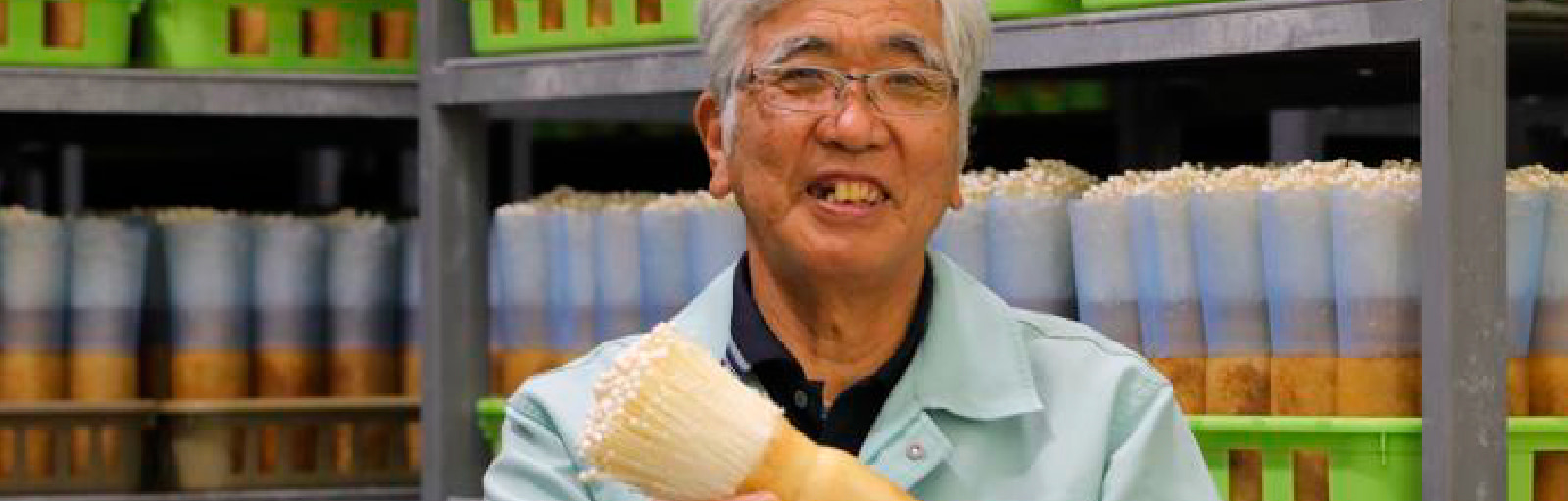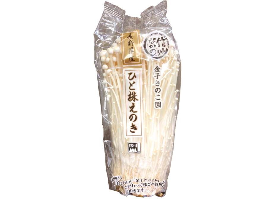 金子きのこ園は中野市生産者組合の中でえのきの栽培技術に優れた生産者になります。ひとつの瓶からひと株収穫し、そのまま商品化することで通常のえのきより計量の作業工程を省くことができます。より栽培されていた状態に近い形での出荷にこだわることで、より鮮度の良いえのきがヤマナカこだわりの【ひと株えのき】です。