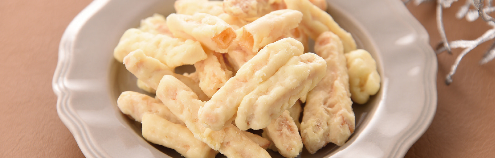国産原料の芋けんぴに口あたりなめらかなホワイトチョコをコーティングしました。