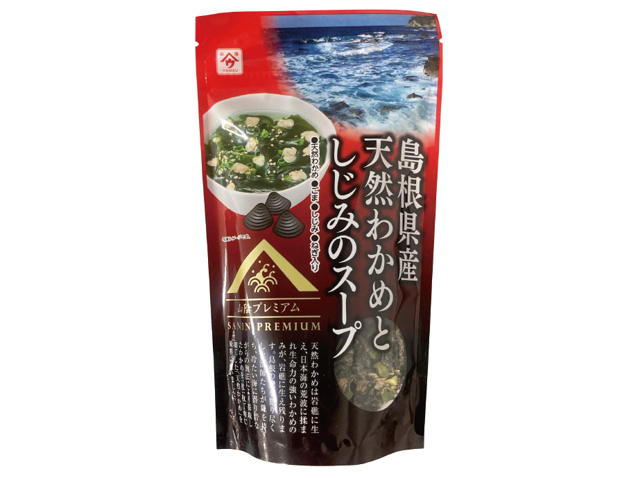 豊富な磯の香り、シャキシャキした食感の希少な島根県産の天然わかめを使用。わかめスープの定番具材の、しじみ、ねぎ、ごまをミックスし満足度の高いスープに仕上げました。1袋で約15杯分とボリューム感も魅力です。