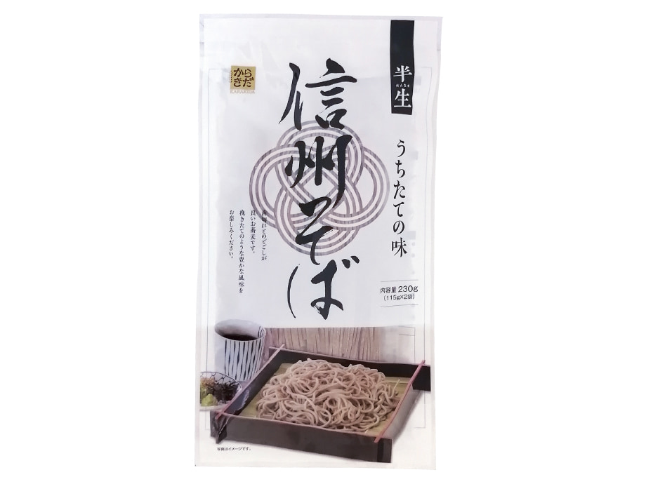 ざるそば、かけそばにも適している半生タイプのそばです。うちたての味により近づけるため半生そばに仕上げることで、もっちりとした食感が味わえます。保存についても常温保存ができます。一人前115gずつを個包装し二人前のセットになった使い勝手の良い半生そばです。